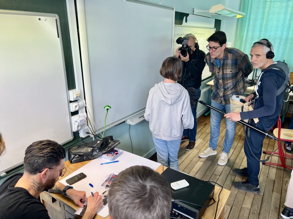 Le contexte était bien particulier, car une équipe de journalistes de France TV était présente dans le cadre de la réalisation d’un reportage qui sera diffusé sur Stade 2 avec Alexandre Boyon comme journaliste. Si on pouvait s’attendre à ce que les jeunes pousses soient intimidées par la caméra, ce ne fut pas le cas. Malgré l’objectif et la perche, la curiosité avait pris le pas. Avant de commencer, notre rédacteur en chef et porteur de ce projet d’éducation aux médias, Léandre Leber, posait une question toute simple : « On va se rappeler comment d’aujourd’hui ? » Les enfants répondaient à l’unisson : « En écoutant ! » De son côté, Jérôme Thomas posait les bases de cet échange, qu’il attendait. Il demandait le tutoiement, car mettre du vouvoiement aurait mis une distance entre lui et les journalistes en herbe, ce qu’il refusait catégoriquement. Les mains se levaient et le dialogue s’installait.